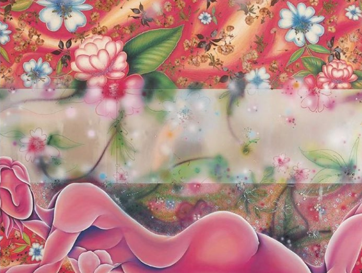 72’’ X 48’’ / 2012 / Mixed media - broken kimchi pot, dried plants, broken glass, acrylic paint, fabric, foam clay, spray paint, blow torch on wood panel