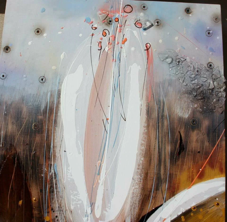110 x 74 / 2014 / Mixed media - coke can, broken glass, staples, fabric, blow torch, carving wood, dried plants, deco paste,